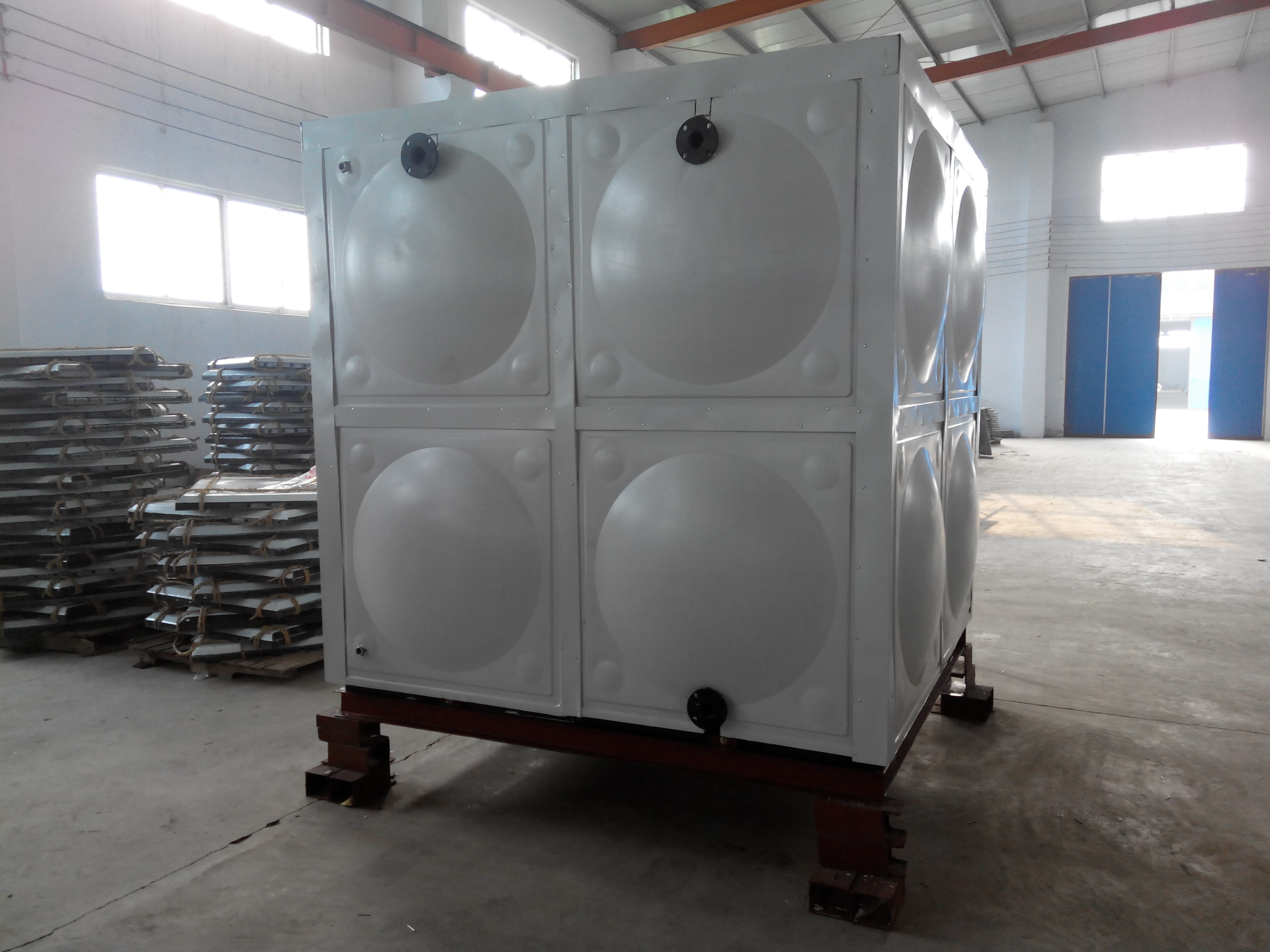 搪瓷水箱的貯水容積從1.0—1000立方米,可按用戶要求的尺寸生產(chǎn)組裝。它的板面有那些而致密釉層混合形成厚度約200-300微米的擴(kuò)散層,加大了搪瓷面的附著強(qiáng)度。 搪瓷水箱的進(jìn)水管、出水管及溢流管的管徑、位置由設(shè)計(jì)決定,水箱四周應(yīng)有不少于600mm通道,箱底及箱頂不少于800mm,用槽鋼底架支撐箱底,內(nèi)用不銹鋼拉筋加固,塊之間用橡膠條密封,用螺栓緊固,使之強(qiáng)度更大。